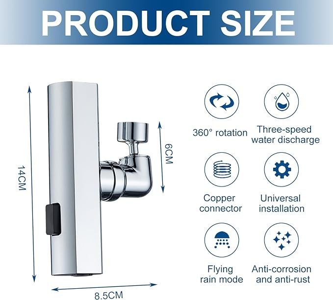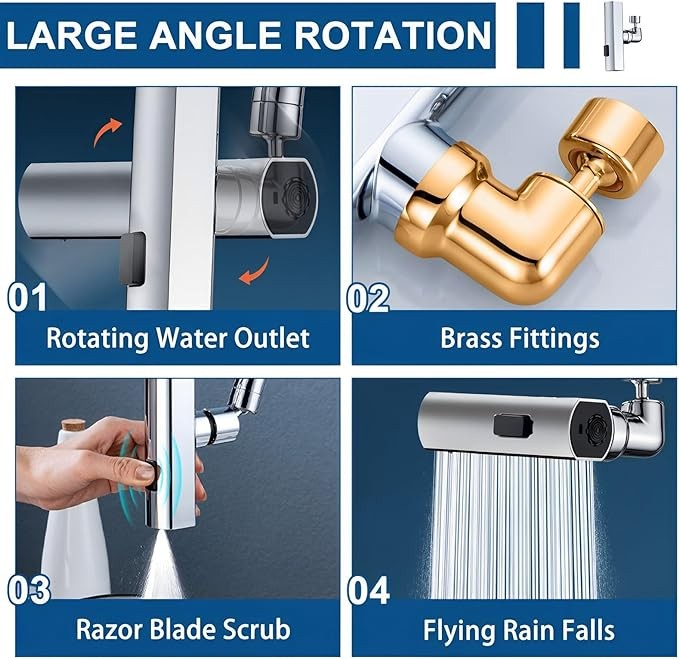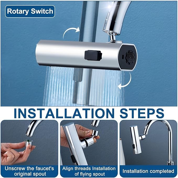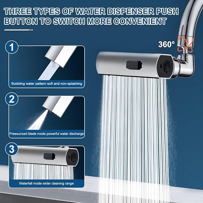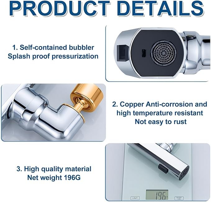 سهولة الاستخدام: بفضل دورانه الكامل بزاوية 360 درجة، يمكن للماء أن يصل إلى كل جزء من حوض المطبخ بكل سهولة، مما يجعل التنظيف أكثر فعالية.