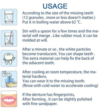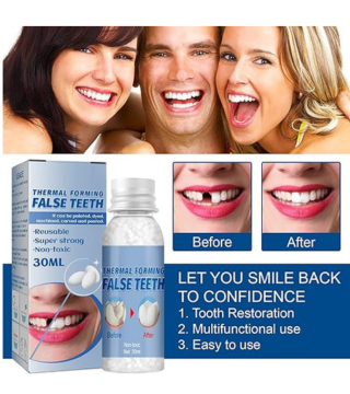 يعتبر هذا المنتج مثاليًا لإصلاح أطقم الأسنان في مجالات متنوعة، بدءًا من استخدامه في الأفلام والتلفزيون وصولاً إلى استخدامه في اللعب الأدوار المختلفة ومشاريع DIY.